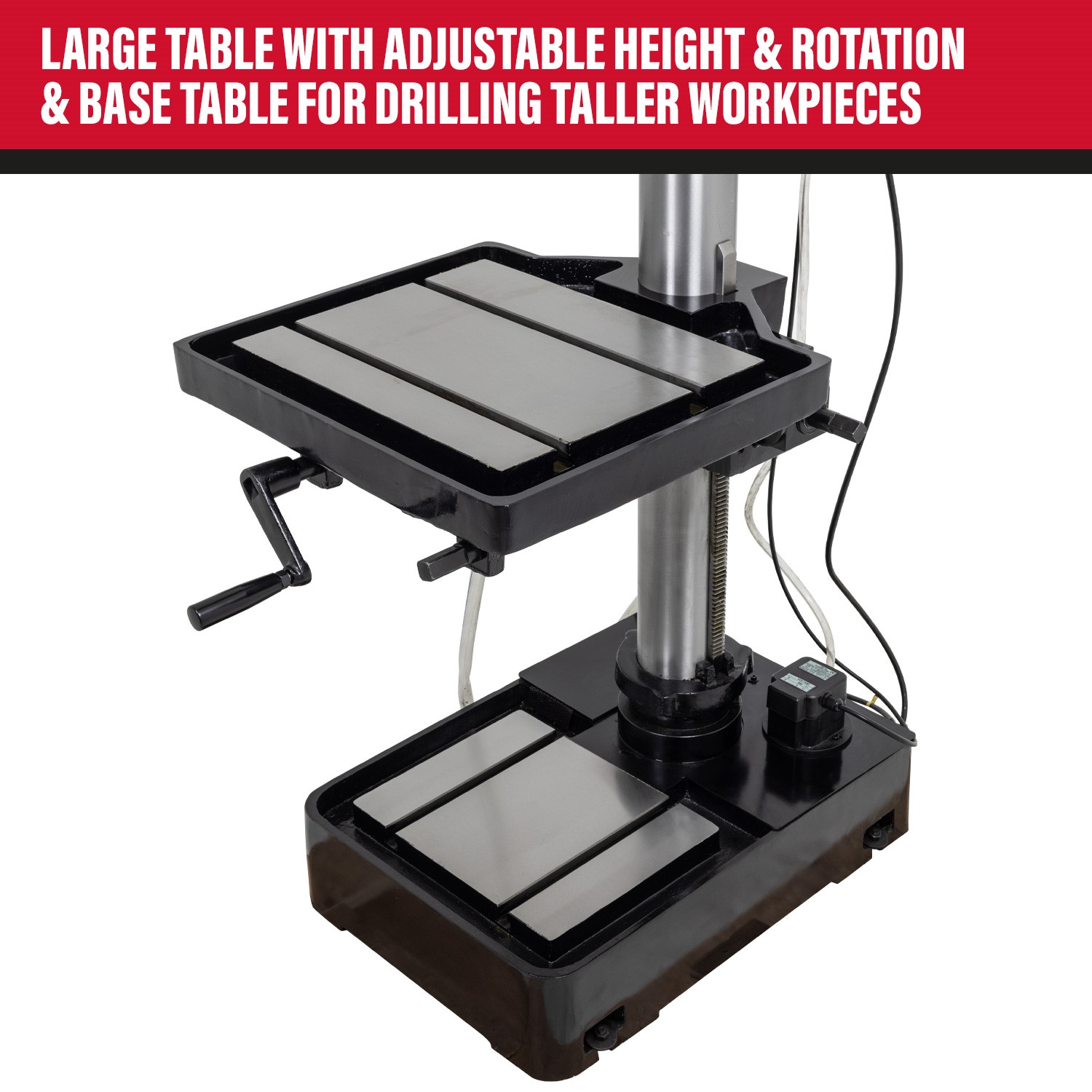 - A large height-adjustable drill press table offers versatility when handling different thicknesses and heights. It rotates left to right for added clearance for longer workpieces.