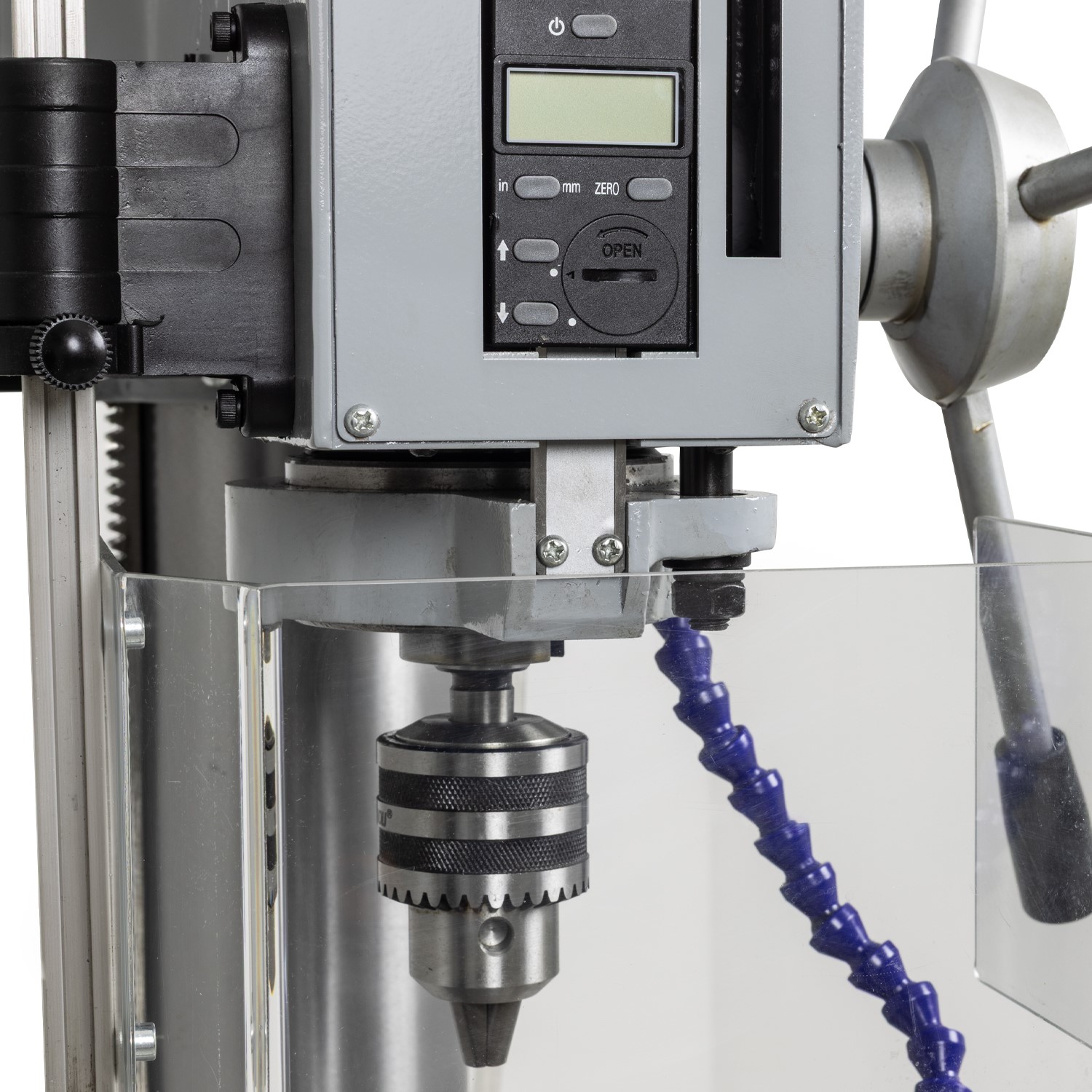 - For added safety, a protective chuck guard shields users from swarf and debris. It also disables the drill when opened.
