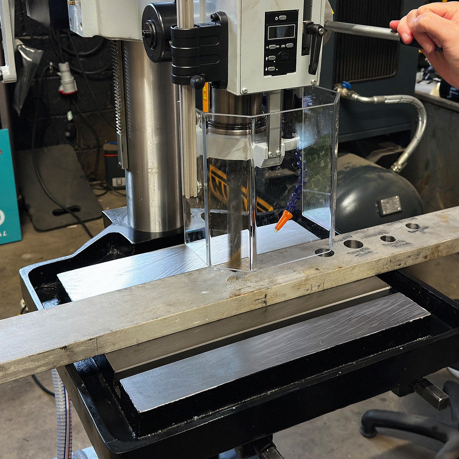 - Chrome steel drill feed handle ensures operators can safely control the descent of the drill bit.
