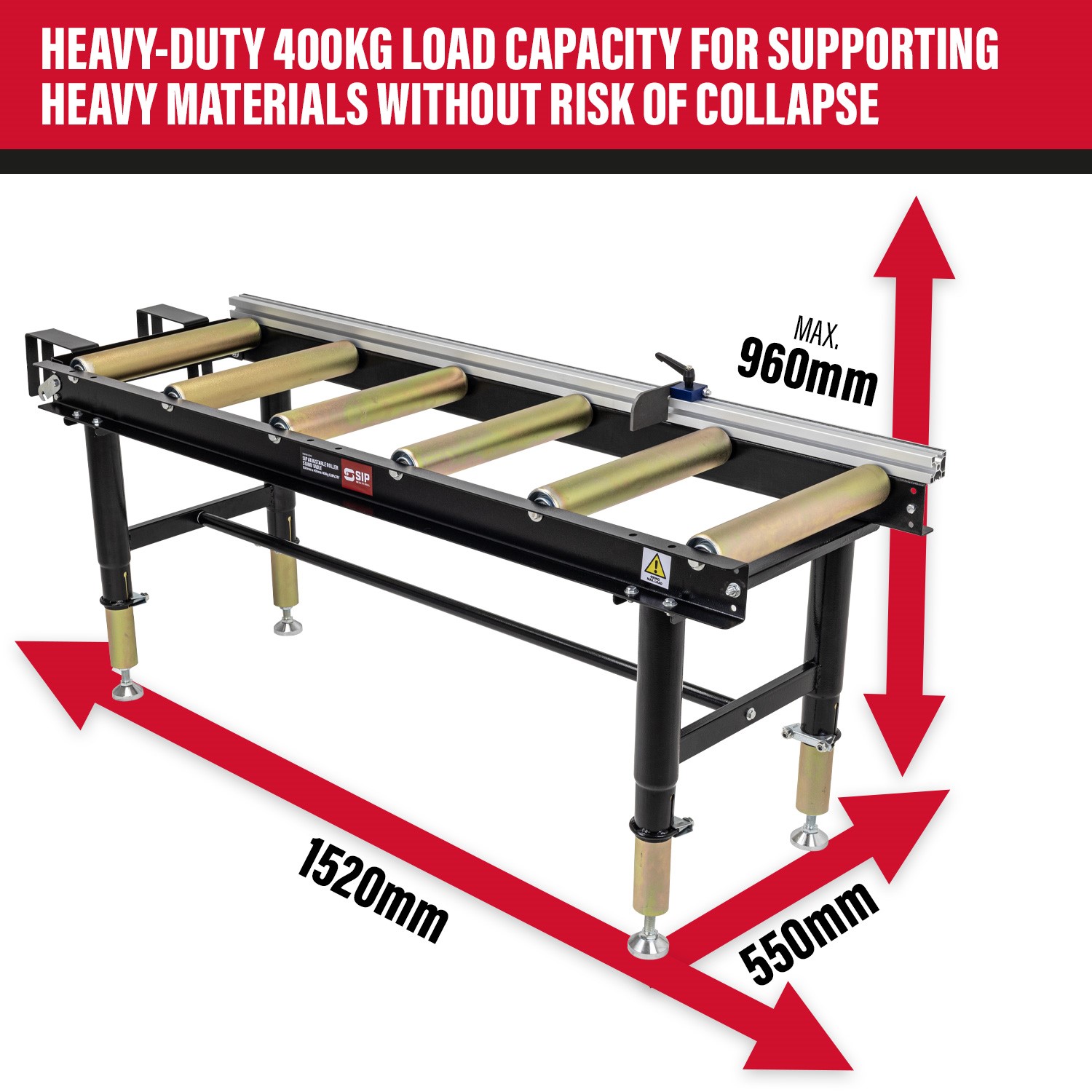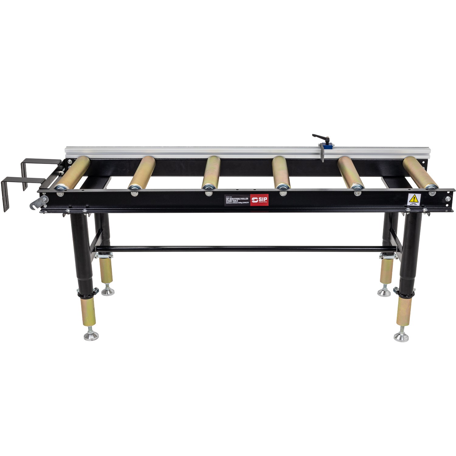 The SIP 01395 Adjustable Roller Stand Table 1500mm x 400mm 400kg is a heavy-duty and high-capacity roller stand table designed for professional metalwork workshops. Featuring height adjustable legs to precisely match the working height of metal-cutting bandsaws, other machinery and workbenches, it’s modular design also allows for multiple tables to be connected together for greater flexibility. A fitted material stop with a 1500mm measurement scale and flip stop also supports accurate measuring and cutting, while 3 spirit level indicators ensure the roller stand is perfectly level before use.